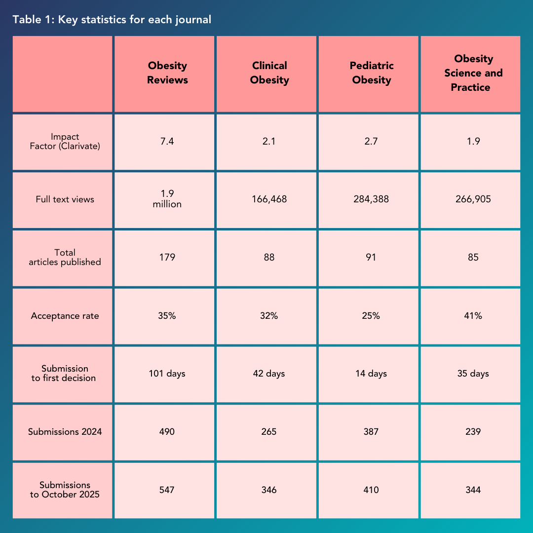 The World Obesity journals continue to thrive thanks to the efforts of the journals’ editors and associate editors, as well as the academics and clinicians submitting articles. The table below shows the journal metrics for 2024 (as always there is a lag before the current year data becomes available) as well as information showing a rising number of submissions in the year to October 2025.