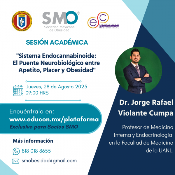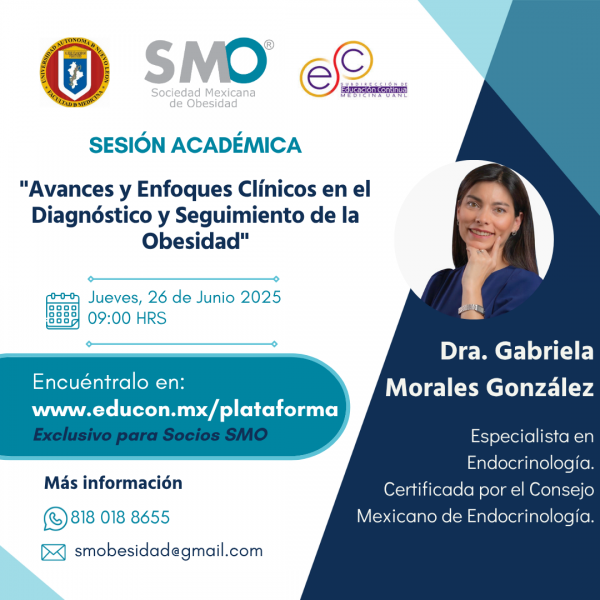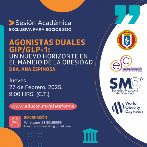 A member-exclusive Academic Session for SMO members, titled ‘Dual GIP/GLP-1 Agonists: A New Horizon in Obesity Management,’ was delivered by Dr. Ana Espinosa. The session was streamed on 27 February 2025 through the online platform of the UANL School of Medicine. Its purpose was to provide scientific updates on obesity management.