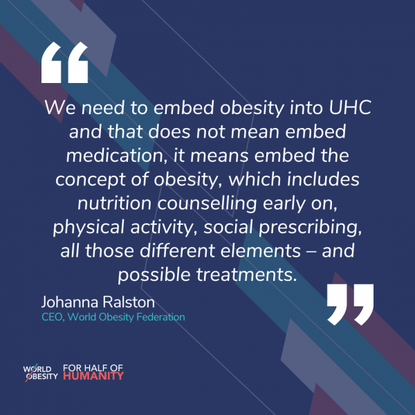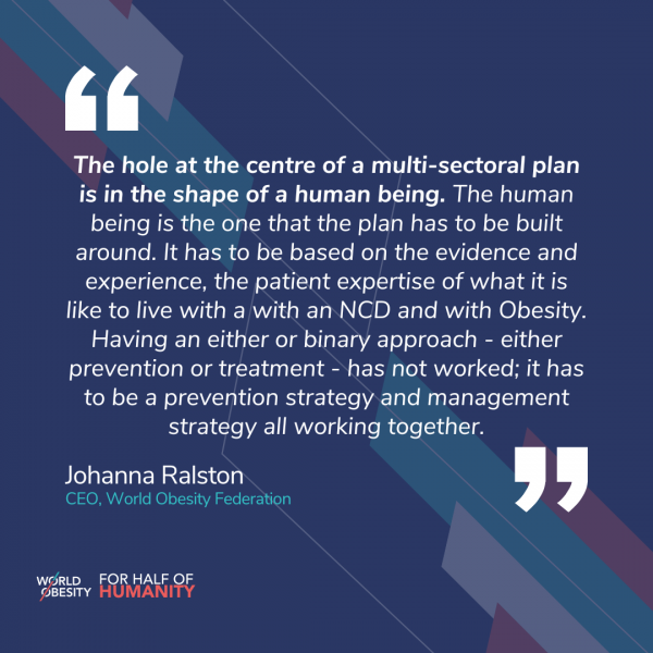 "The absence of obesity in primary care in the Political Declaration means that it only addresses half of the problem, which is unfortunate because we need an integrated prevention and management approach as outlined in the WHO acceleration Plan." Johanna Ralston CEO speaking at the UN High-Level Meeting on NCDs